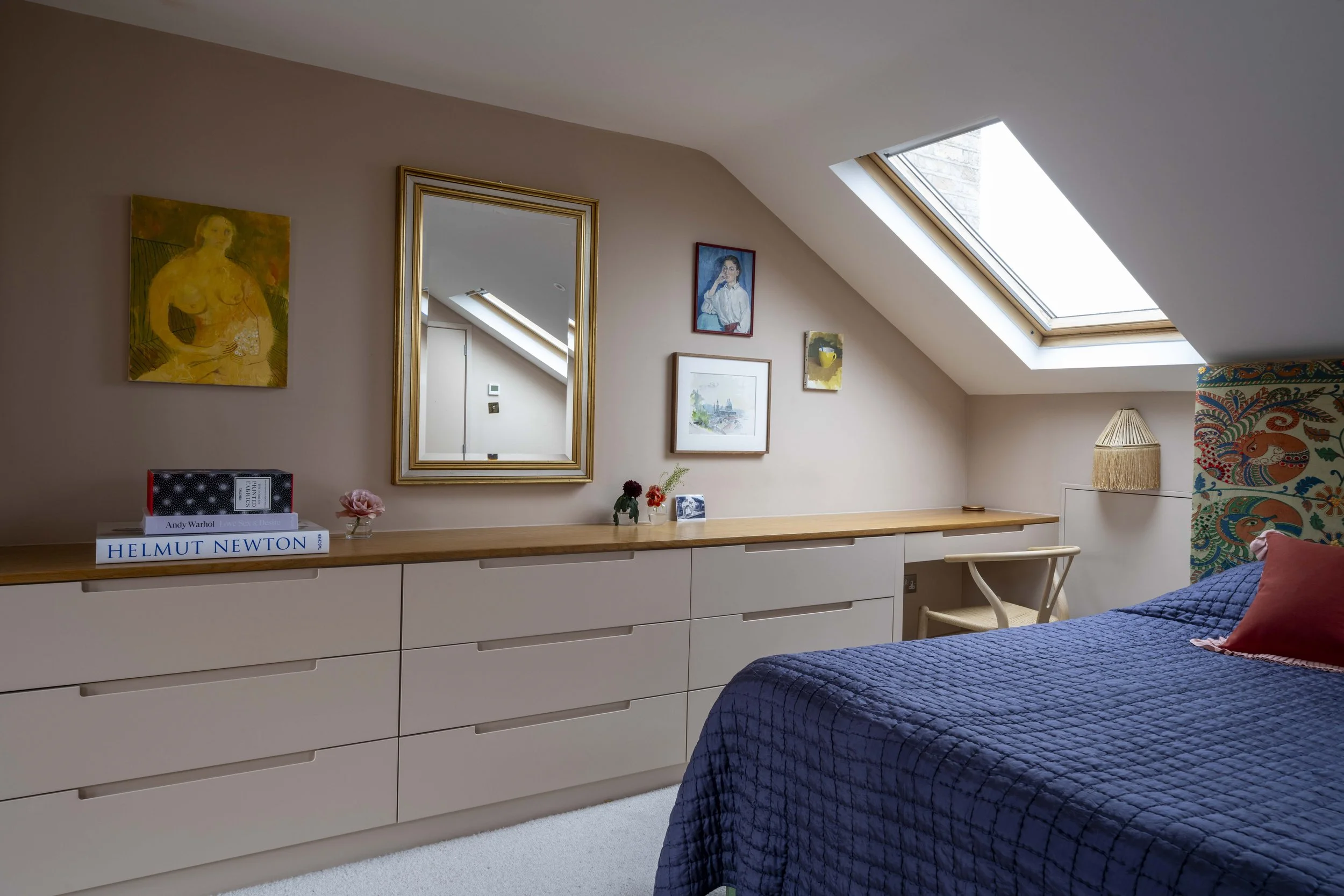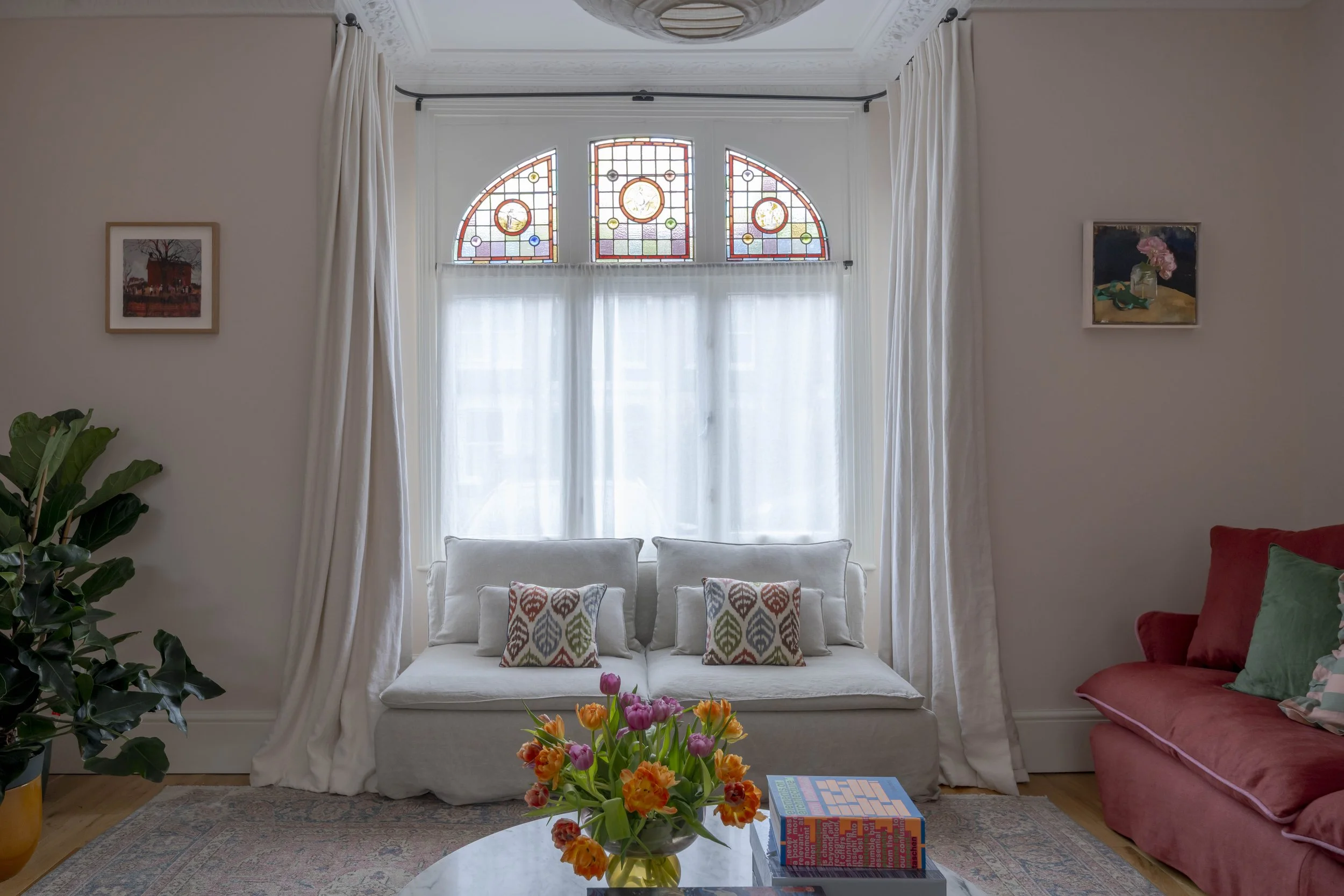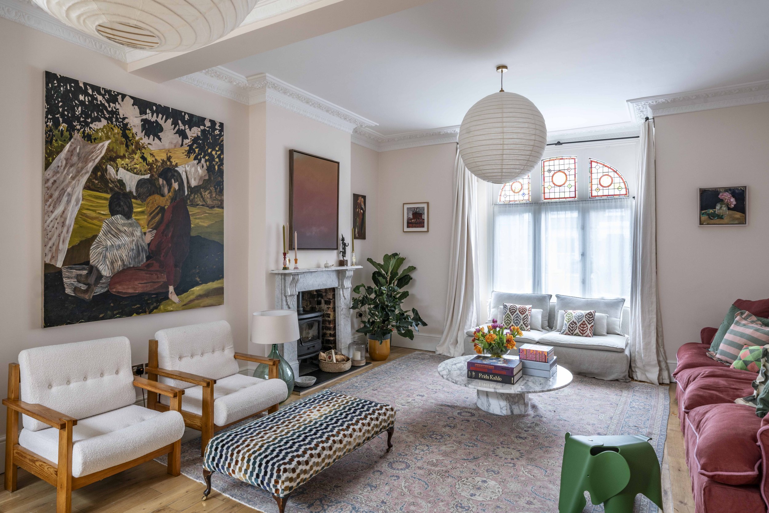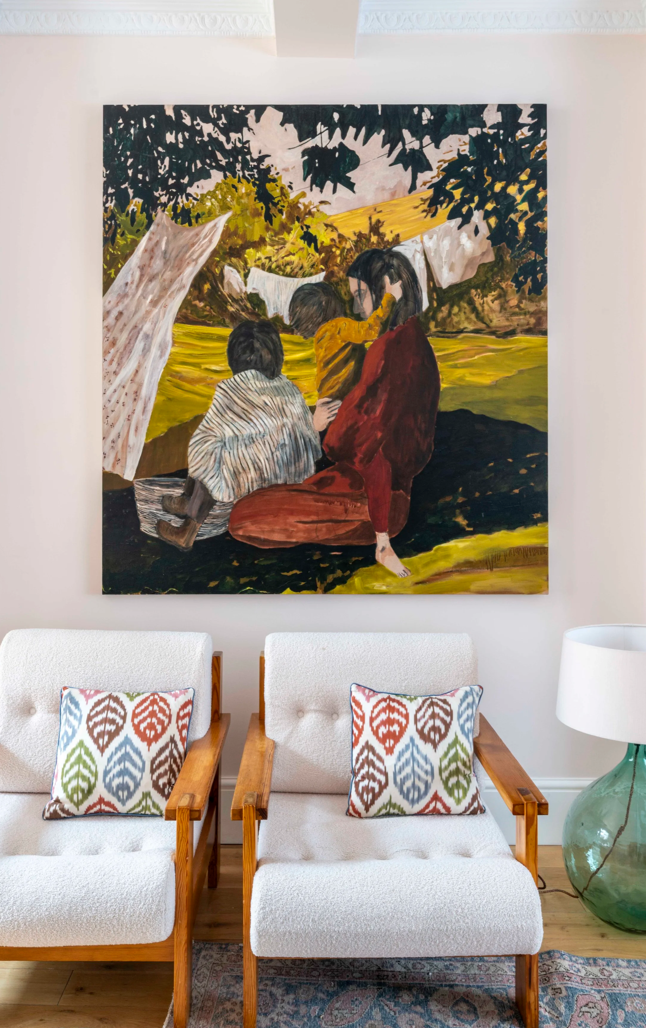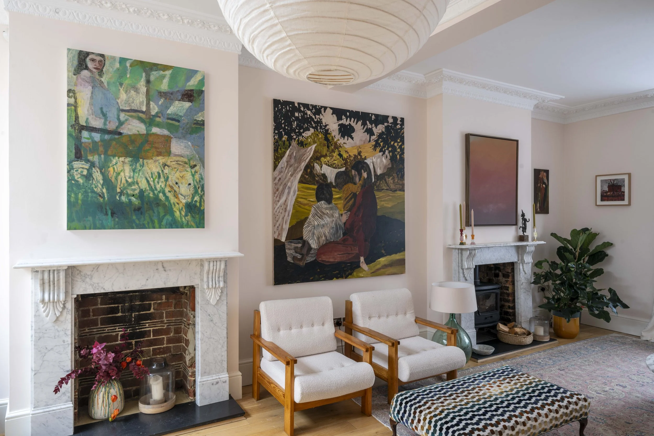 The owners of this home in Dulwich were instinctively drawn to joyful, colourful figurative works that explore themes of family and human connection. In the sitting room, an emotive large-scale painting by Australian-based artist Ben Crawford anchors the space, accompanied by works by Diarmuid Kelley, Justin Williams, and Noah Saterstrom.