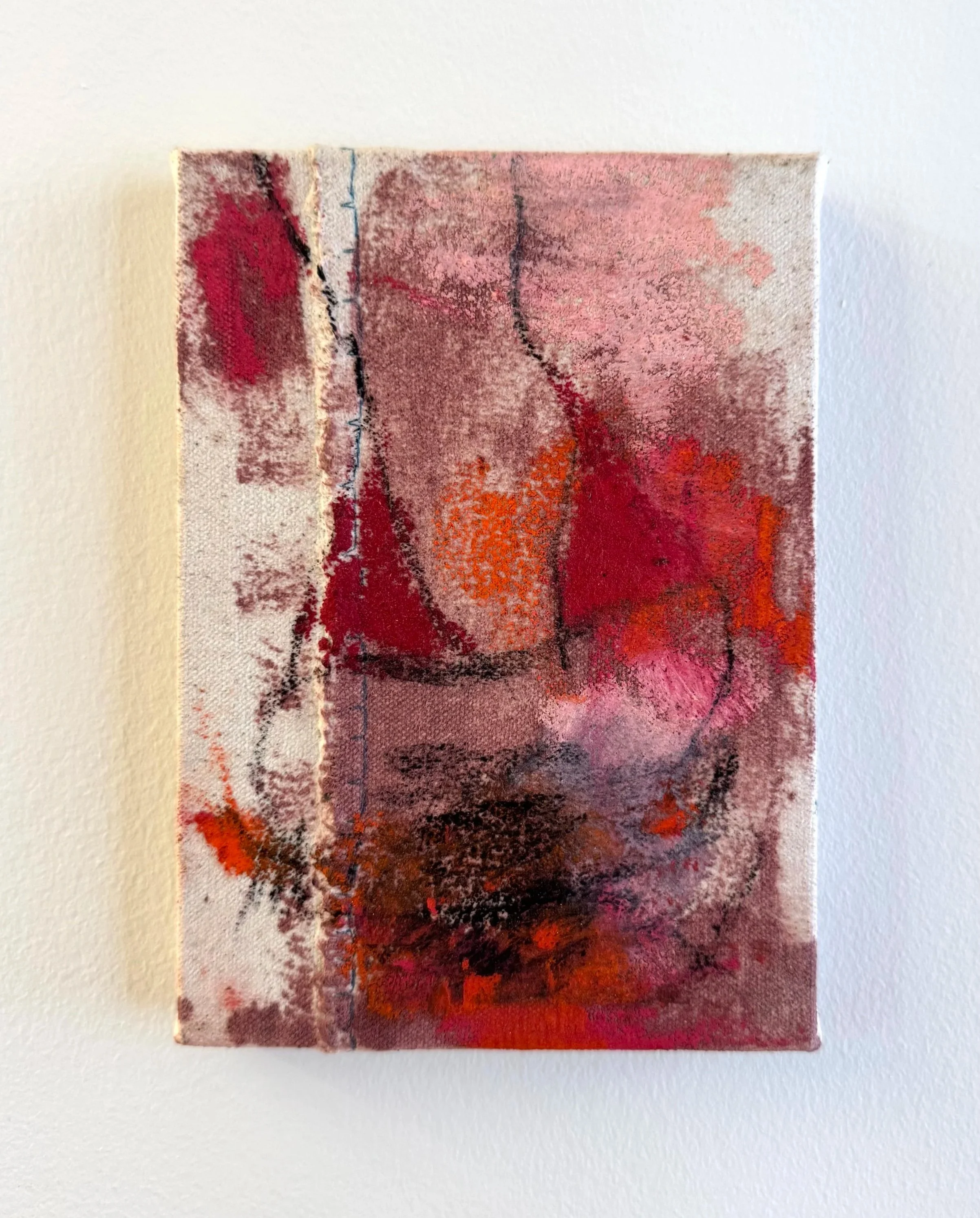 Ellie Walker ‘Bikini’, 2025Oil, oil stick and thread, charcoal on canvas.20.5 x 25.5cm / 8 x 10 inches Enquire Enquire
